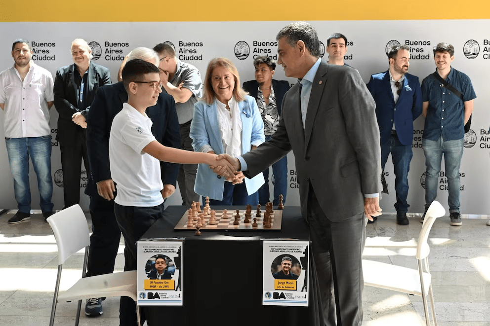 La jornada comenzó a las 14 con la ceremonia oficial en la Jefatura de Gobierno porteña. El jefe de gobierno de la Ciudad, Jorge Macri, acompañado por Alicia Masoni de Morea, vicepresidenta 1ª del Comité Olímpico Argentino, dio la bienvenida a los 12 participantes y comprometió el apoyo estatal al ajedrez. “Organizamos el 99° aquí, hoy celebramos el centenario y ya les confirmo que en 2026 también seremos anfitriones”, afirmó. Incluso jugó una partida rápida con Faustino Oro, que terminó igualada en pocos movimientos.